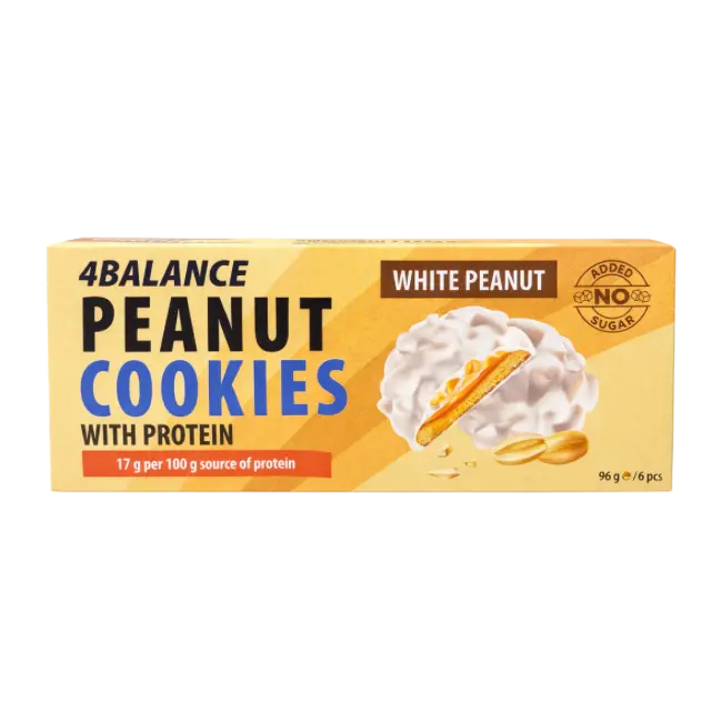 4Balance Peanut Cookies White Peanut are delicious protein cookies combining a crunchy biscuit with creamy peanut protein filling and smooth milk coating. Each cookie delivers a satisfying peanut flavour. At the same time, they provide a source of protein (17 g per 100 g). This makes them a great alternative to traditional sweets.