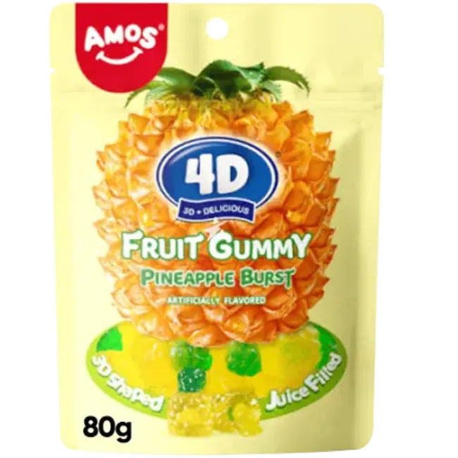 Amos 4D Pineapple Juice-Filled Gummy Candy features a realistic 3D pineapple shape and a juicy texture. It offers both visual appeal and a fun eating experience.