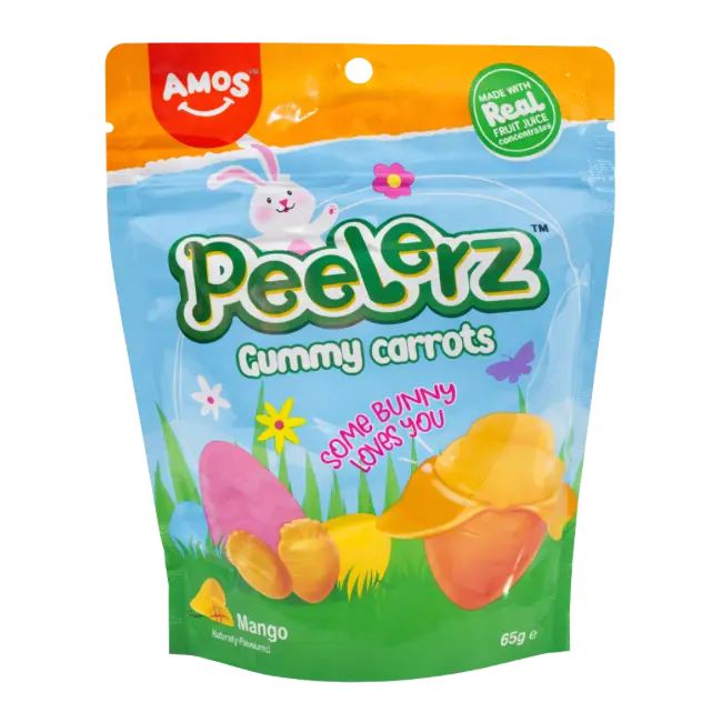 Add a fun and fruity twist to your sweet collection with Amos Peelerz Gummy Carrots Mango. This is a playful and unique candy perfect for Easter and everyday snacking. For even more variety, Amos Peelerz Gummy Eggs are another delightful choice in the range. These peelable gummy sweets are shaped like mini carrots and offer a delicious mango flavour. They are made with real fruit juice concentrates.