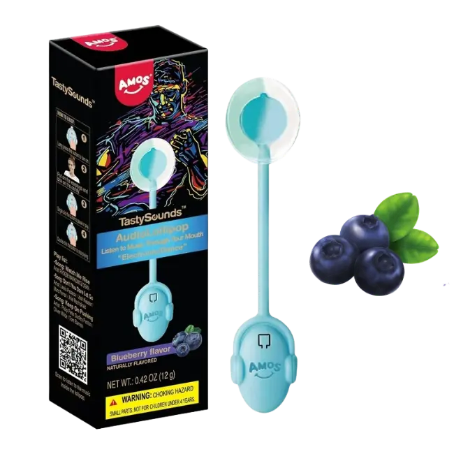 TastySounds Audio Lollipop Blueberry combines rich blueberry flavour with interactive sound technology. Experience the Amos Audio Lollipop Sound Taste Blueberry sensation. Music is transmitted through vibrations while enjoying the candy. This creates a unique listening experience.
