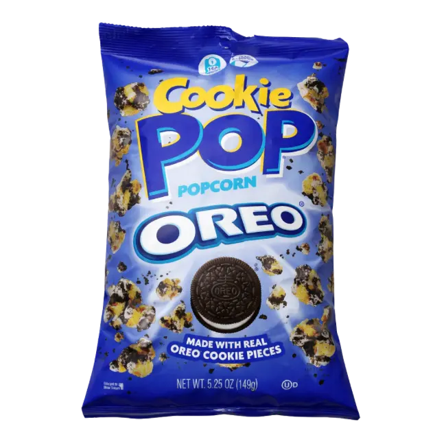 Cookie Pop Popcorn Oreo 149g combines fluffy popcorn with real Oreo cookie pieces for the ultimate sweet treat – now available at Candy World Ireland.