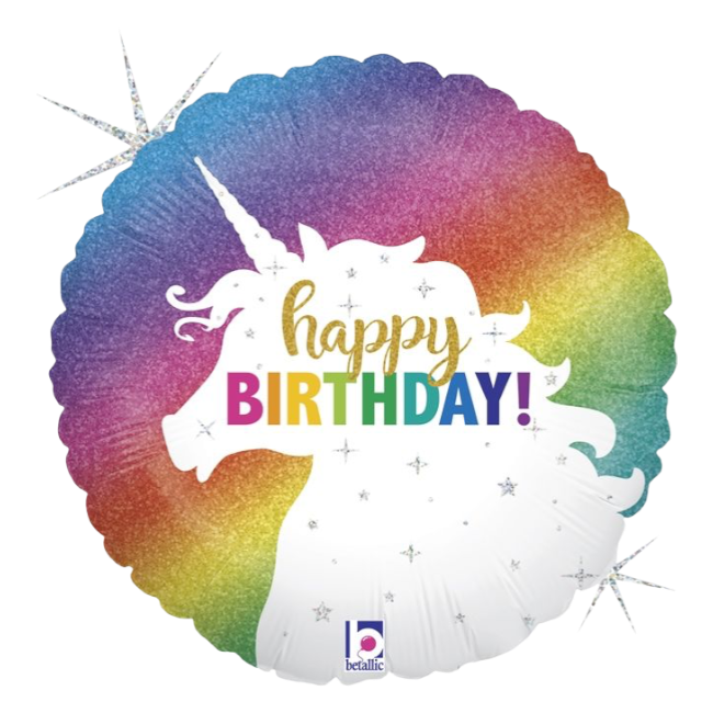 This enchanting 18-inch “Happy Birthday” foil balloon features a shimmering rainbow gradient backdrop highlighted by a graceful unicorn silhouette, sparkling star accents, and vibrant multicolour lettering, creating a look that feels both magical and joyful. Perfect for themed party décor, whimsical backdrop styling, and memorable birthday photos, it brings a bright sense of wonder and celebration to any special occasion.