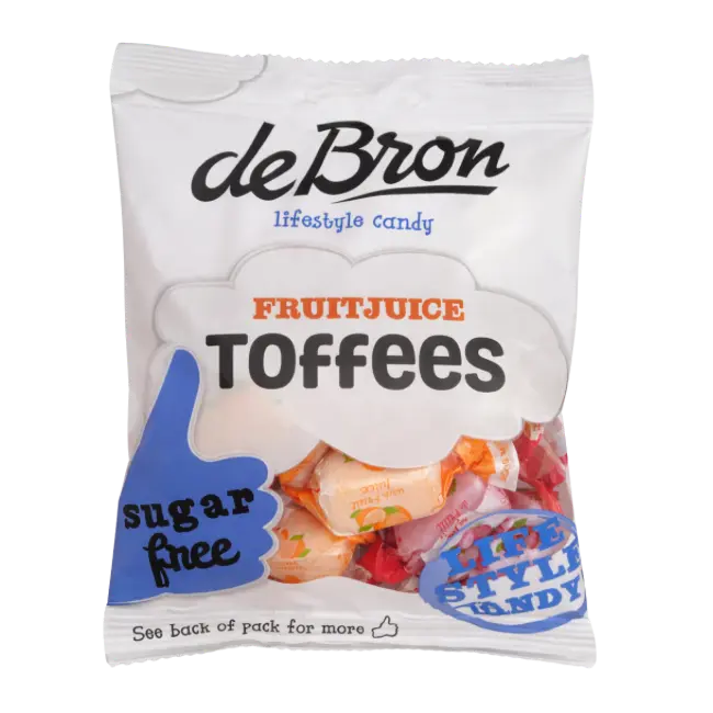 DeBron Fruitjuice Toffees are delicious sugar free fruit candies with a smooth, creamy texture and refreshing fruity taste. They are made with concentrated fruit juices (1%) and are sweetened with maltitols, mannitol, and sucralose instead of sugar. As a result, they offer a satisfying sweetness without added sugar.