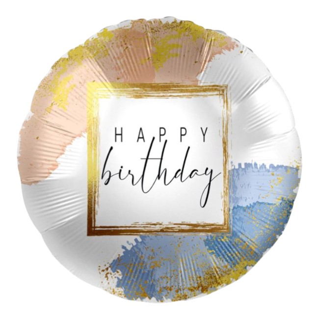 This elegant “Happy Birthday” foil balloon features a clean white base accented with soft blush, muted blue, and delicate gold brushstroke details, creating a look that feels modern, artistic, and refined. The minimalist framed lettering adds a touch of sophistication, making it perfect for stylish party décor, photo backdrops, and memorable birthday celebrations.
