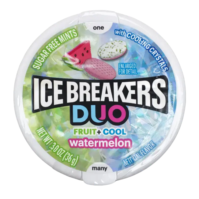Ice Breakers Duo Fruit + Cool Watermelon (36g) deliver the perfect balance of fruity sweetness and icy freshness. Each mint features a dual-layer design. The juicy watermelon fruit side pairs with a cool, refreshing mint layer for long-lasting freshness.