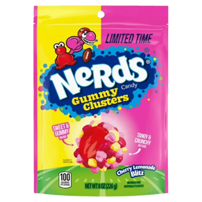 Nerds Gummy Clusters Cherry Lemonade Blitz combines crunchy Nerds candy with a soft and fruity gummy center.