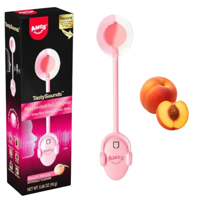 Amos Tasty Sounds Recordable Lollipop Honey Peach is perfect for birthdays, party favours, Valentine’s Day, or unique gift boxes. It’s especially popular with kids, but also loved by adults looking for a playful and original gift idea. Combining flavour, fun, and personalisation, this product stands out as more than just a sweet — it’s an experience.