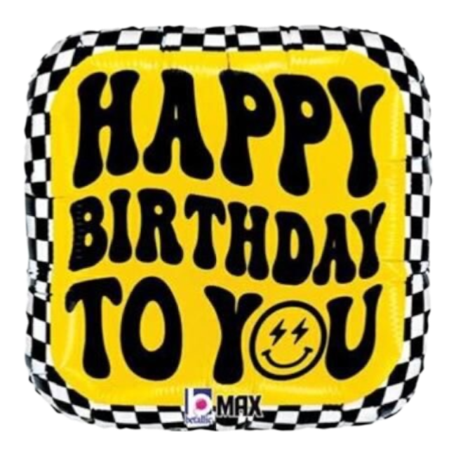 This bold 18-inch “Happy Birthday to You” foil balloon features a vibrant yellow centre framed by a striking black-and-white checkerboard border, paired with playful black lettering and a fun smiley detail for a look that feels both modern and energetic. Crafted with recycled material for a more thoughtful celebration, it is perfect for eye-catching party décor, backdrop styling, and memorable birthday photos, adding a lively and stylish touch to any special occasion.