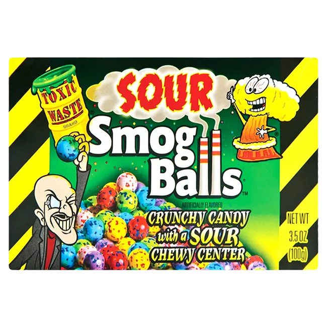 Toxic Waste Sour Smog Balls candy is made for serious sour candy fans. It combines a crunchy outer shell with a sour and chewy center for a bold texture contrast.